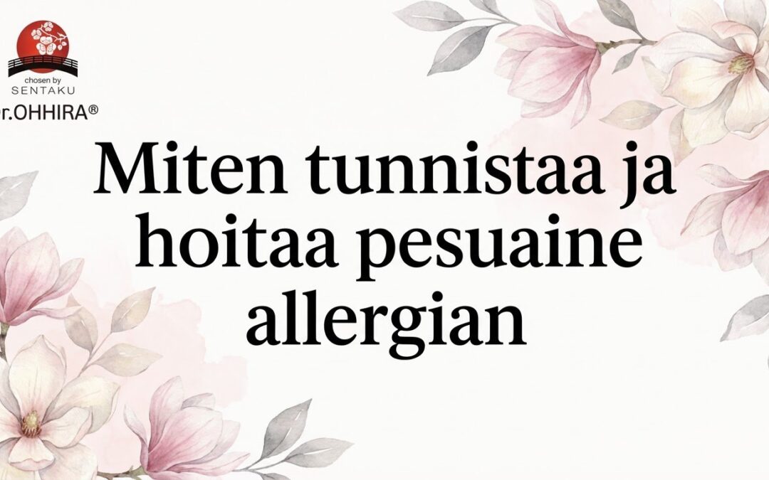 Kuvassa pesuaineallergia-kartta, joka listaa pesuaineiden sisältämiä allergeenejä: hajusteet, väriaineet ja säilöntäaineet. Taustalla Dr.OHHIRA® logo.